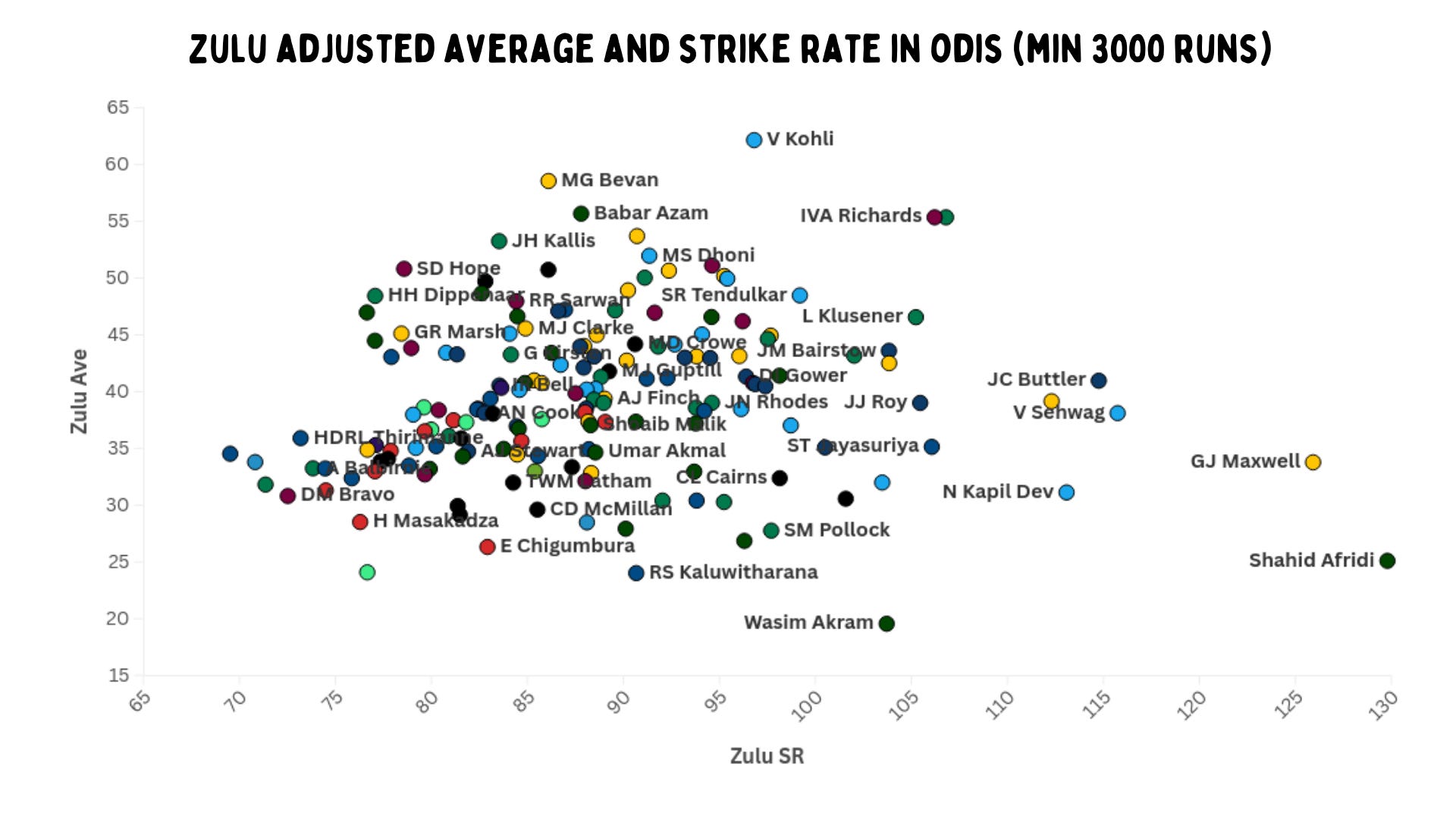 Bevan, one of the greatest chasers ever, is second on Zulu average. Another player of a similar archetype – taking it deep in a chase – is Dhoni. But their adjusted numbers aren’t as similar as we would have expected. Bevan averaged more, but Dhoni was quicker.