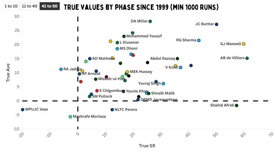 De Villiers is an outlier in the death overs as well, with a better true strike rate than the likes of Maxwell and Afridi. Buttler is a bit slower, but has the second best true average. Rohit and Morgan are the other two batters that have a true strike rate of over 40 in the final ten overs of the innings. Miller has the best true average.