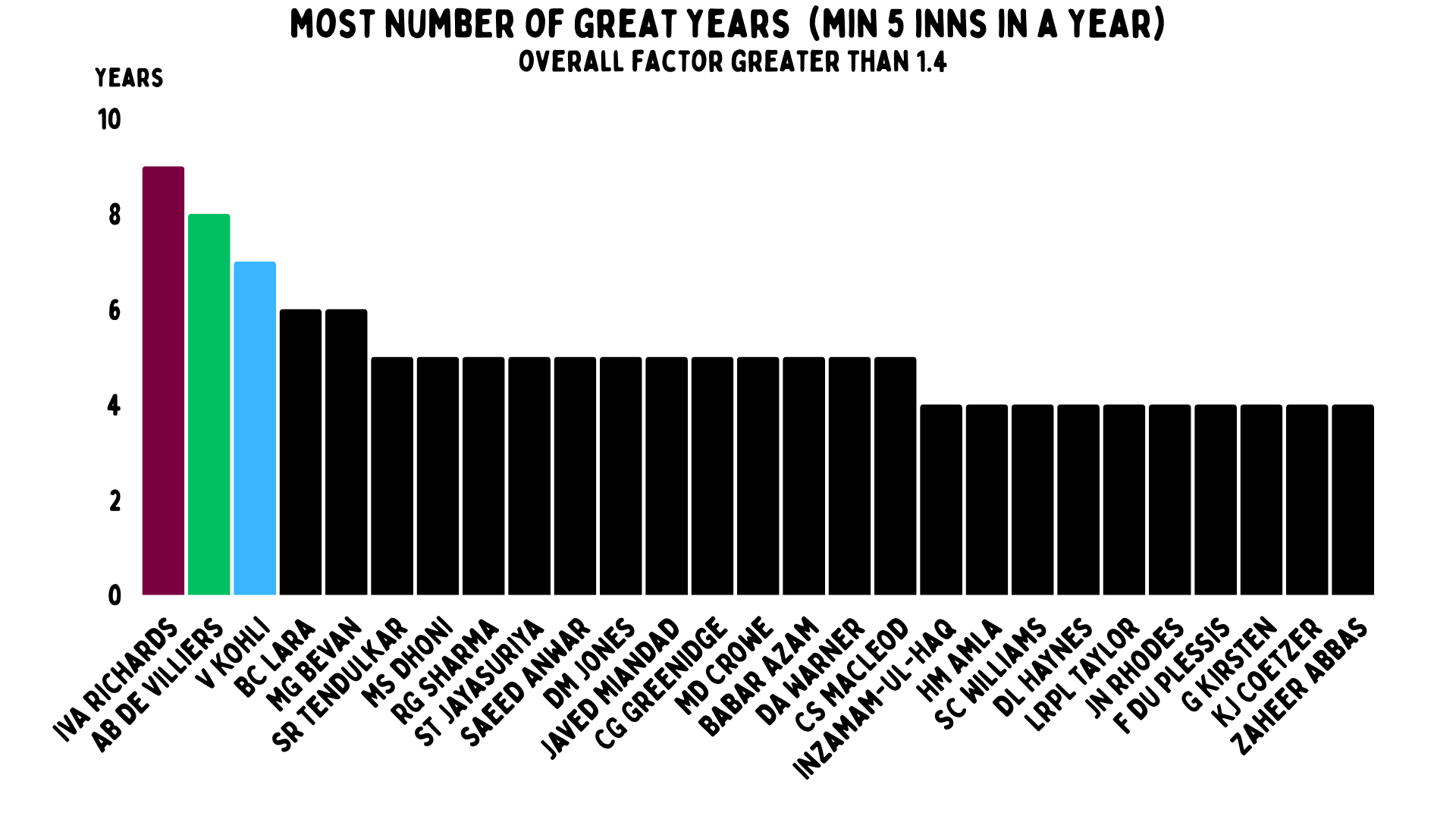 For great years, the top three are Richards, de Villiers and Kohli – they have nine, eight and seven years of being great. Lara and Bevan are at six, while many others are tied at five.
