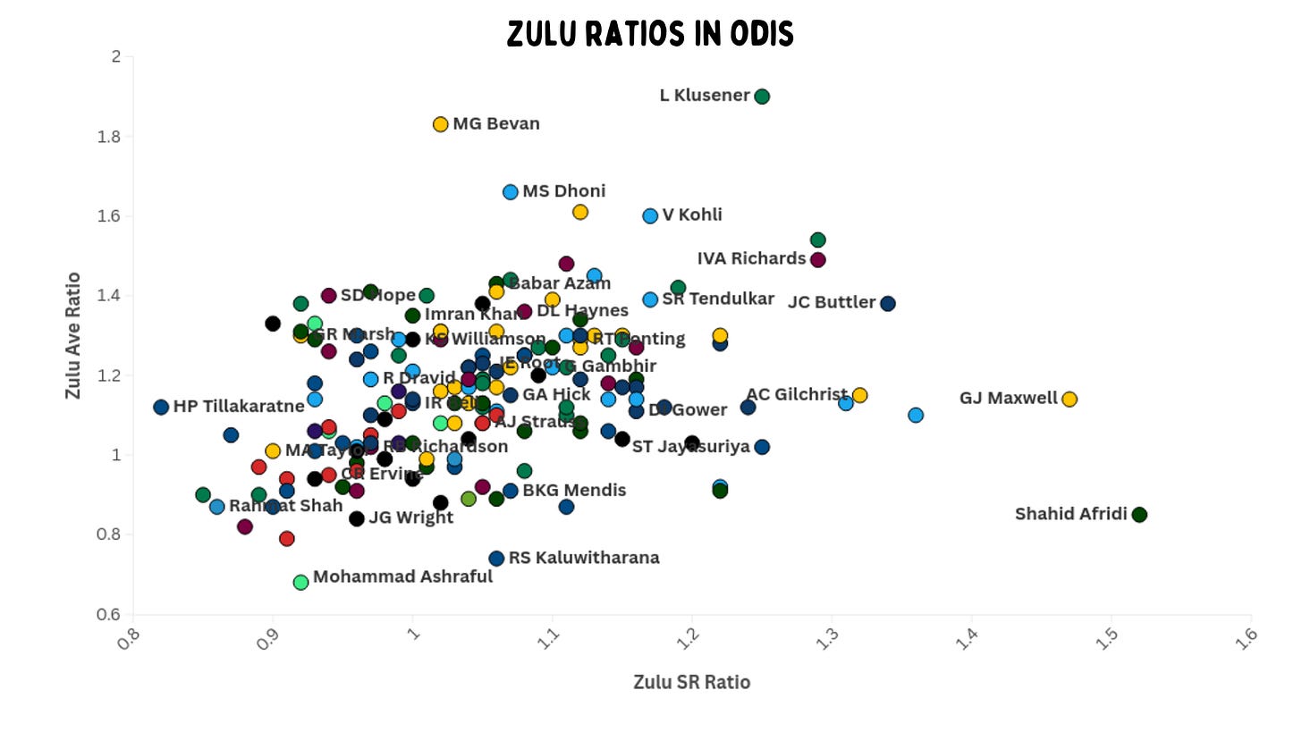You may be wondering why we’ve called this the Zulu metric. Take a look at this graph and see where Lance Klusener, also known as Zulu, is. He’s 1.9 times better on average and 1.25 times on strike rate. He was truly his own genre. He was a batting allrounder who was treated like a bowler who can bat by South Africa for most of his career.