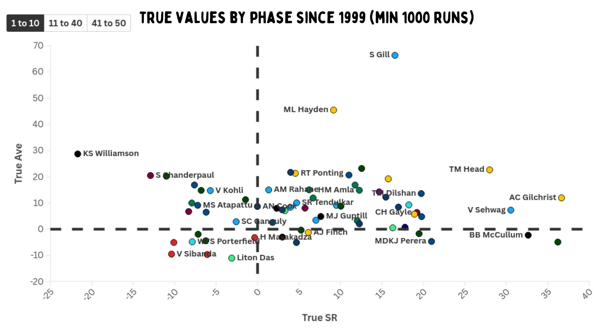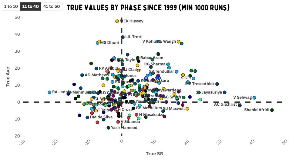 Five openers continue smacking the ball around even after the field restrictions are lifted – Afridi, Sehwag, Roy, Gilchrist and Jayasuriya. Hussey has the best true average from overs 11 to 40, but at a negative true strike rate. Kohli does his best work in this phase of the game – with true averages comparable to Dhoni, Bevan and Trott – but at a true strike rate well above 10. De Villiers and Mark Waugh have a similar true average at a true strike rate of around 17 to 18. However, for Bevan and Waugh, this doesn’t include their career numbers before 1999.