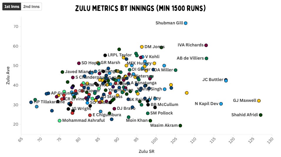 Shubman Gill has basically started his career as the best first-innings batter ever on the Zulu metric. Of course, it’s a small sample size, but it has been a ridiculous start. But the real boss of the first innings is Viv Richards. De Villiers is close in terms of strike rate, but Richards is averaging a staggering 10 more.