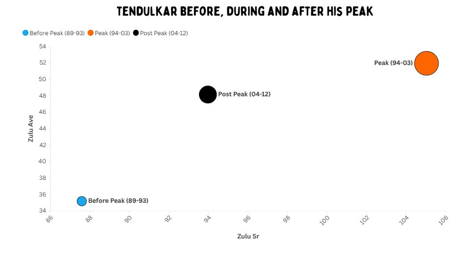 Sachin Tendulkar was a plus batter for 18 years. We said this for Tests: it means India simply did not have to worry about a replacement with him on their side. He was about a par player before his peak, but that came when he was in his teenage years and early 20s. From 1994 to 2003, his numbers are like the overall careers of Richards and de Villiers. After 2004, he was still an incredible run accumulator.
