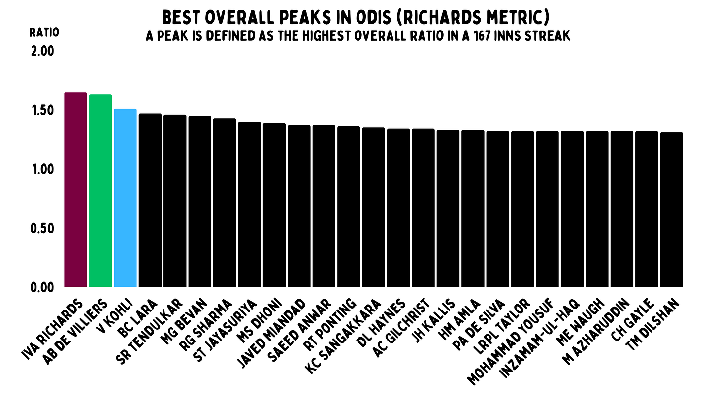 We’ve decided to use 167 innings as the threshold. Why 167? That’s the number of innings Richards had batted in. And a bit like Bradman, you can make an argument that his entire career was one long peak. He had 12 plus years, with nine of them being great.