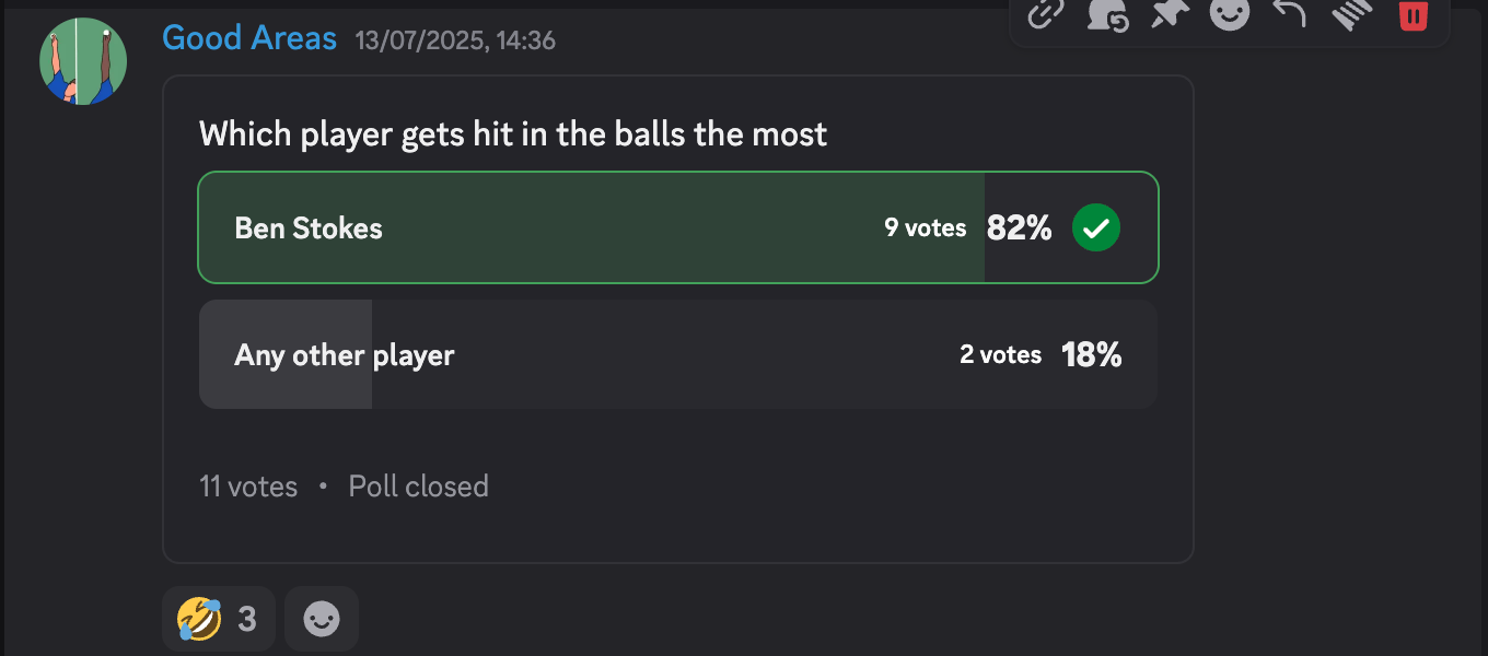The only way to make this official was to head to our Discord channel and put up a poll, and 82% of the people think Ben Stokes gets hit more in the groin than any other player. This is now scientifically accurate, peer-reviewed. The English captain is the most likely to be struck in the balls of any modern cricketer.