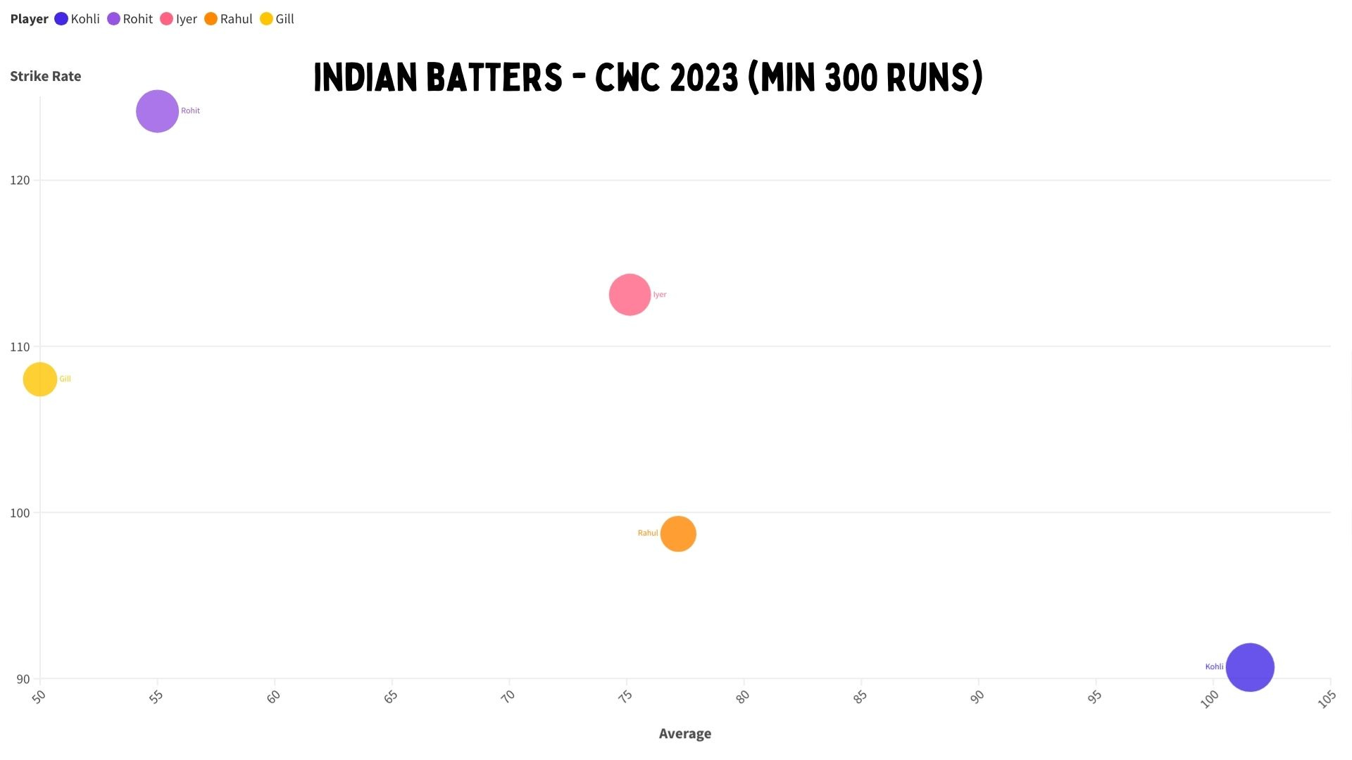 So, here’s a look at the Indian top 5 batters. This makes things very clear. Rohit is the aggressor at the top-order, who will go nuts in the Powerplay no matter what. The fact that he has had such little failure in a high-risk role makes it even more special. Virat is the anchor. He has the most runs in this World Cup, also the most by any batter in a single World Cup. He’s usually looked to bat through the innings.