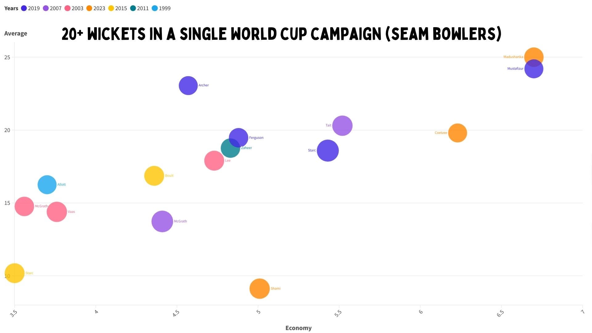Shami just casually walked into the side off the bench and is now the highest wicket-taker despite playing 4 games fewer than most of the contenders. He has now taken 23 wickets at 9 (NINE!!) runs a piece, striking every 2 overs. I think it would be a very fair argument to consider this as one of the greatest bowling campaigns by a bowler in a World Cup. Starc 2015 is still a massive outlier. But that is for another day.