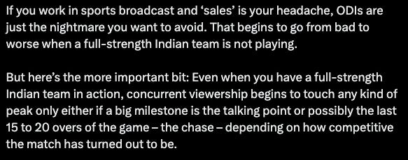 ODIs are really hard to sell for advertisers, they peak at odd times, and not as often as T20 matches. People do not sit down and watch ODIs in full any more, and they are no longer the party format of cricket. These two things were what made the format so strong, so this is hard to overcome.